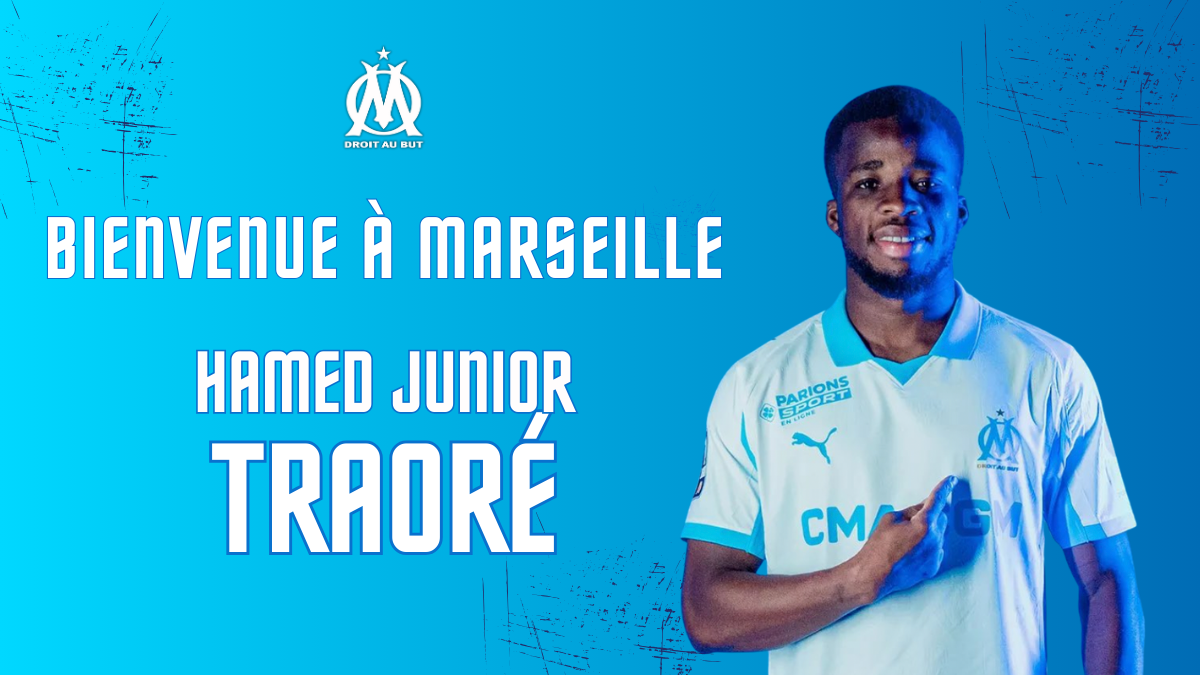 L’Olympique de Marseille a officialisé ce vendredi 29 août 2025 la signature de Hamed Junior Traoré, milieu offensif ivoirien de 25 ans, en provenance de Bournemouth. Le transfert s’effectue sous la forme d’un prêt avec option d’achat estimée à 7,5 millions d’euros, avec un contrat de cinq ans à la clé, liant le joueur au club phocéen jusqu’en 2030.