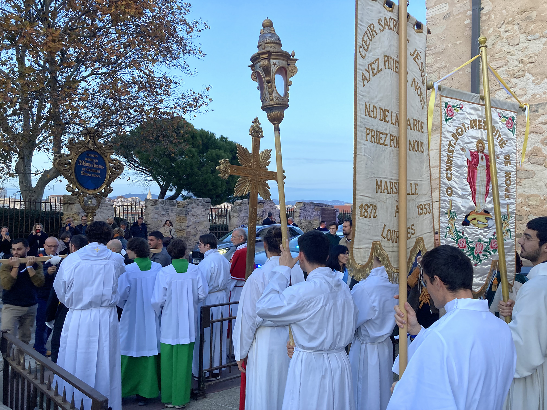 Lentement, le cortège s’est rassemblé avant d’entamer la montée de la rue des Lices puis de la rue Vauvenargues en chantant Avé Maria, assistés des tambourinaires, et rendant grâce à la Vierge à l’enfant : « Notre-Dame de la Garde, vigie infatigable qui signale tous les dangers, priez pour nous ».